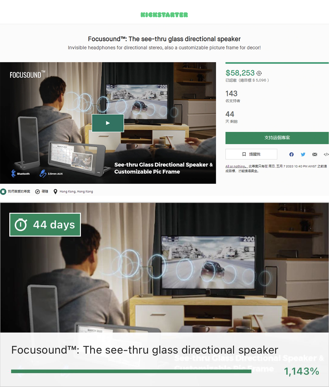 3月23日,美國東部時間11點(北京時間3月23日23點),清聽聲學(xué)聚音屏Focusound Screen ®全透明屏幕定向發(fā)聲音箱正式在美國Kickstarter開放眾籌。根據(jù)ks眾籌頁面數(shù)據(jù)顯示,這款定向音箱目前已有143名支持者,上線1小時已達(dá)成目標(biāo)金額,10小時眾籌完成率高達(dá)1143%,遠(yuǎn)超預(yù)期的眾籌目標(biāo)(數(shù)據(jù)截止發(fā)稿前)。