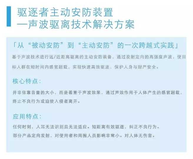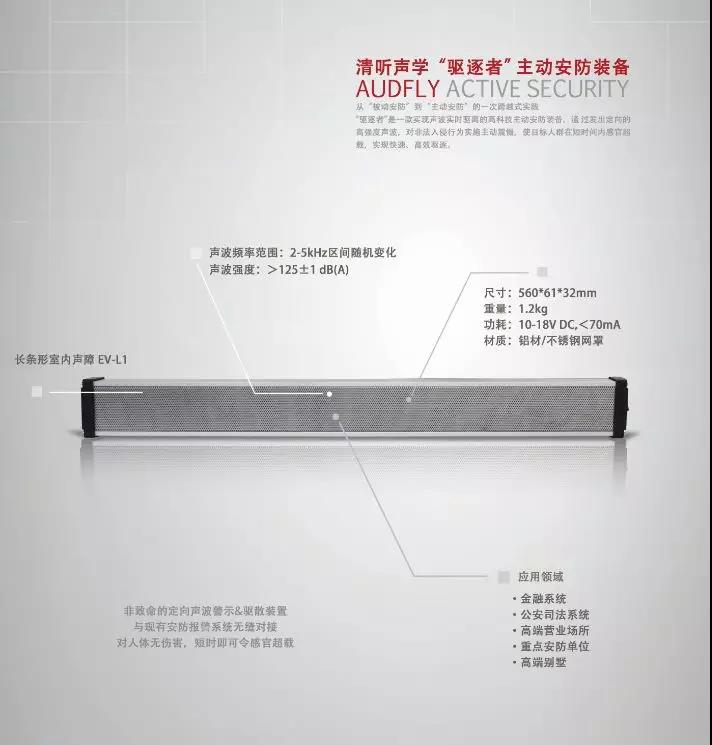驅(qū)逐者主動安防裝置可根據(jù)客戶環(huán)境構(gòu)建制定與之匹配的解決方案,通過多合一構(gòu)造,一臺設(shè)備上整合了抗干擾強、發(fā)出強驅(qū)離性聲波、易安裝等特點。