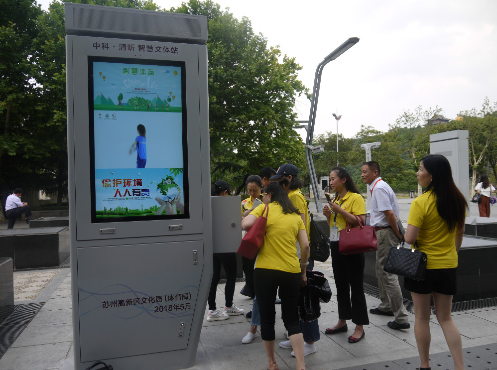 下午,來(lái)自30個(gè)省(市、自治區(qū))參加“文化館廣場(chǎng)舞普及推廣培訓(xùn)班”的52名學(xué)員、京杭大運(yùn)河沿線城市文化館合作發(fā)展聯(lián)盟的20個(gè)文化館負(fù)責(zé)人等來(lái)到蘇州高新區(qū)新區(qū)公園參觀并體驗(yàn)了智慧便民公共文化設(shè)施智慧廣舞場(chǎng)系統(tǒng)。