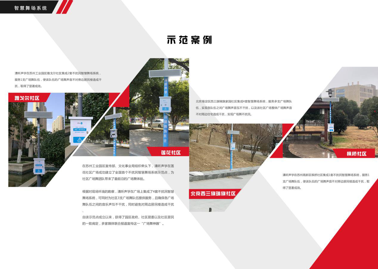此次調研工作開展中,位于蓮花社區的全國首個不擾民智慧舞場示范點被列為考察重點。智慧舞場系統是蘇州清聽聲學為解決廣場舞擾民難題而專門開發的一套聲學高科技系統,通過采用領先的聲學技術將廣場舞音量集中在特定區域內,超過該音區范圍音量會迅速減弱,大大降低廣場舞聲音對周邊環境的干擾,有效解決廣場舞擾民問題,實現廣場舞不擾民。調研團隊率先來到示范點了解建設工作,并實際體驗了智慧舞場系統的不擾民效果。