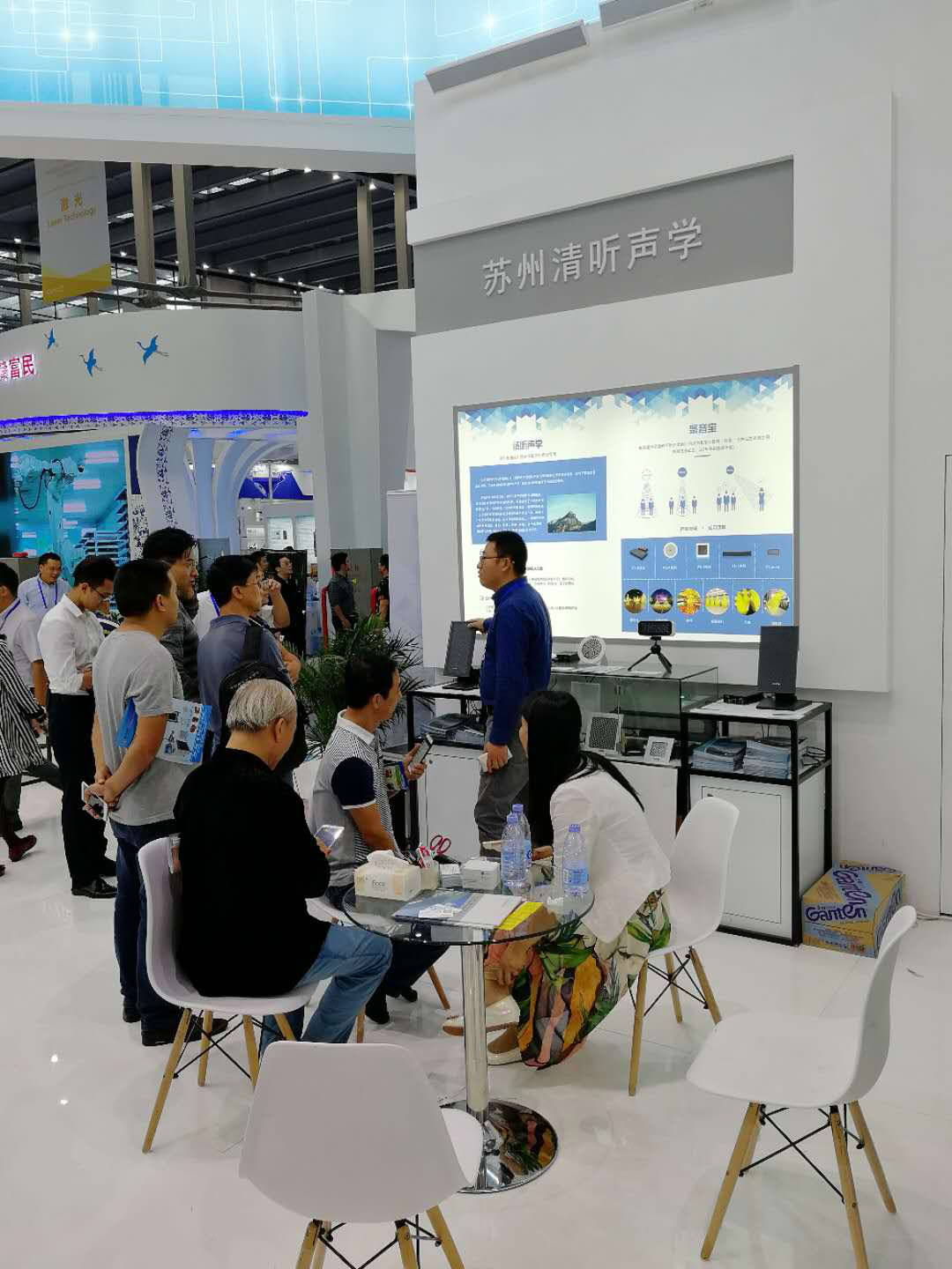 清聽聲學將展位設在江蘇展廳9C08-01展位,陸陸續續的科技愛好者,有的是科技工作者前去與工作人員咨詢與交流。定向音響在中國市場上并不多見,定向聲理念更是讓人著疑并著迷。
