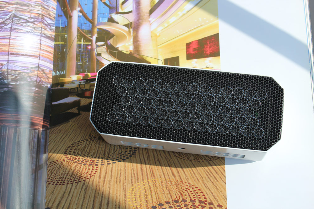 清聽聲學工作人員耐心給展位前的參觀者介紹著旗下主要的定向音響品牌聚音寶,解釋定向聲原理及應用場景。據介紹,聚音寶核心的定向聲技術是通過特殊算法,將超聲波調制成人耳可聽聲,利用超聲波的超指向傳播原理,使聲音形成一個特定角度的聲區往指定方向傳播。簡單來說,就是人們可以在聲源處控制聲音的傳播方向和范圍,有效控制噪聲的產生。該技術已經成功應用到廣場舞音響中,解決了多年以來棘手的廣場舞擾民問題。