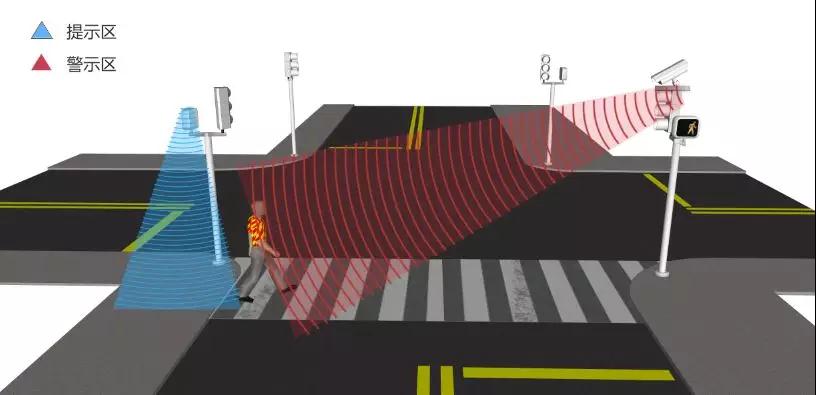 在交通信號燈紅燈亮起時,同時觸發兩個定向語音警示單元:集成在行人等候區的定向語音警示單元可播放道路交通法規、核心價值觀等提示行人不要闖紅燈;集成在人行道另外一端的定向語音警示單元,在接收到行人闖紅燈違規信號時,實時發出僅且輻射整條人行通道的警示聲,警示違規行人退回等候區。