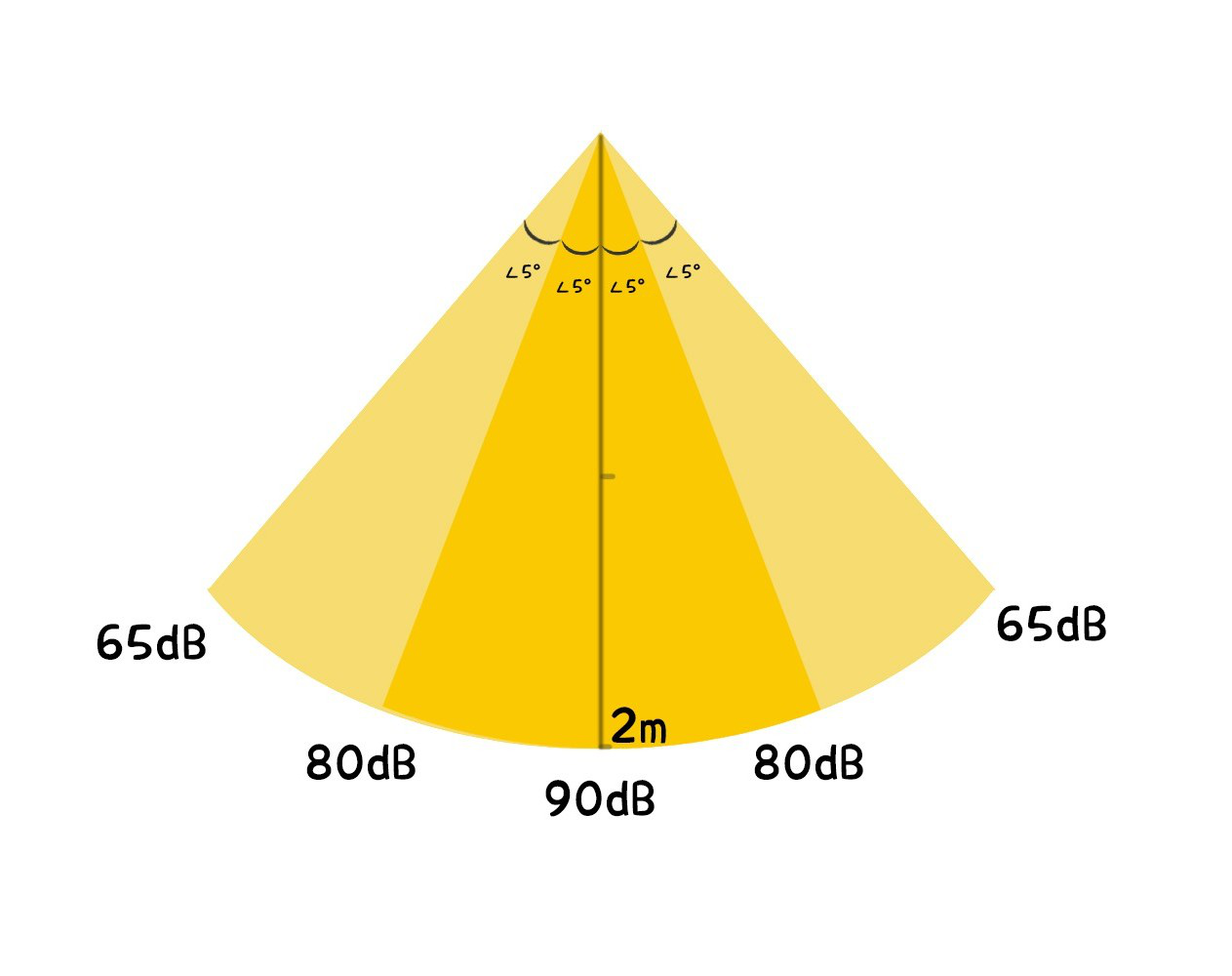 定向音箱的聲波是在聲源正前方區(qū)域呈扇形傳播,具有方向和角度。聲源正前方音量可達(dá)最高,且遠(yuǎn)距離傳播音量幾乎是沒(méi)有衰減的,具體傳輸距離是根據(jù)應(yīng)用需求,調(diào)整聲學(xué)算法確定的。