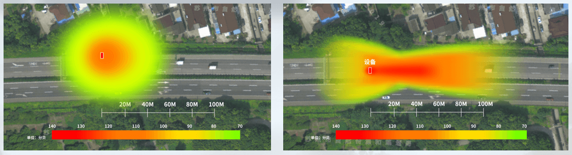 通過聲場對比圖可以看出,普通揚聲器的指向性較差,傳播距離較短。聲音侵入對向車道,語音無法精準播報,無法滿足高速路使用需求。清聽聲學(xué)高速公路定向喇叭既可以做到高聲壓級,遠距離傳播,同時還具有較強的指向性,滿足精準播報的需求。