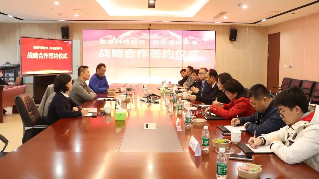 為進一步提升產品競爭力,促進雙方長遠共進,12月4日,蘇州清聽聲學科技有限公司與凱盛科技股份限公司簽署戰略合作協議,雙方達成戰略合作關系。凱盛科技股份有限公司黨委書記、董事長夏寧,黨委副書記、總經理孫蕾等領導一行,清聽聲學董事長栗振等出席簽約儀式。